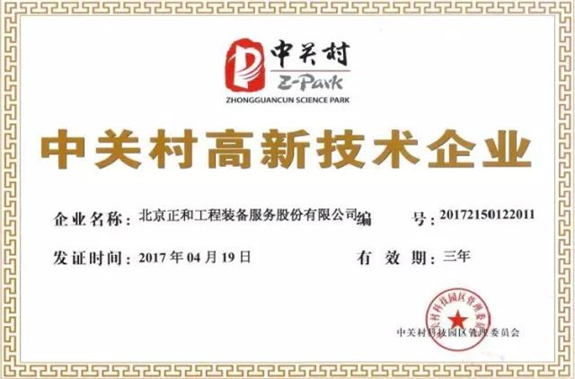 近日,北京正和通過了北京中關村科技園區管理委員會的“中關村高新技術企業”認證。4月19日,中關村科技園區管委會向公司頒發“中關村高新技術企業”認定證書。