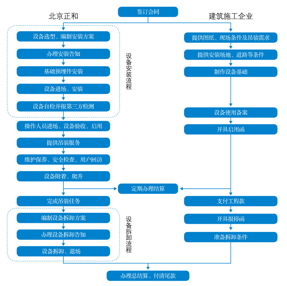 公司緻力于爲(wèi)建築施工企業(yè)提供垂直運(yùn)輸整體解決方案,在提供建築起重設(shè)備租賃服務(wù)的同時(shí),提供所出租設(shè)備的安裝拆卸服務(wù)。爲(wèi)完整反映公司設(shè)備出租及安裝拆卸的全過程,以下租賃服務(wù)流程圖包含了所出租設(shè)備的安裝拆卸流程。