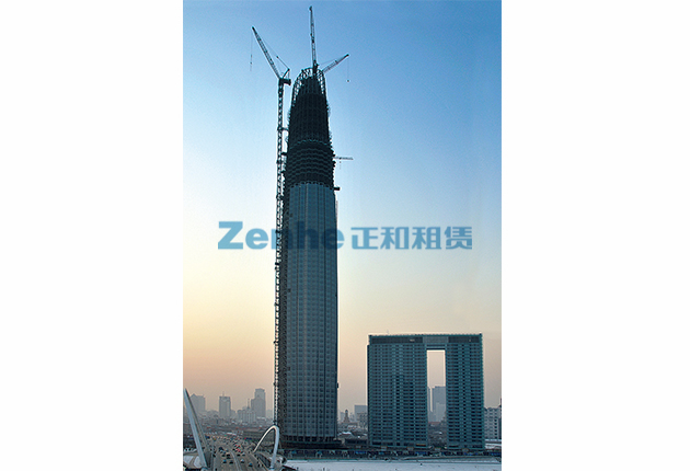 工程位于天津市核心地段,塔樓高度336.9米,爲中國長江以北地區的第一高樓。爲滿足結構施工的需要,公司承接了該工程的4臺塔吊的租賃和安拆任務,分別是H3/36B、K30/21、ST70/30、MC320塔吊,此外公司還承接了兩臺由法福克公司生産的動臂式變幅的內爬塔吊M600D、M440D及1臺外附式ZSL1000塔吊的安拆、爬升任務。